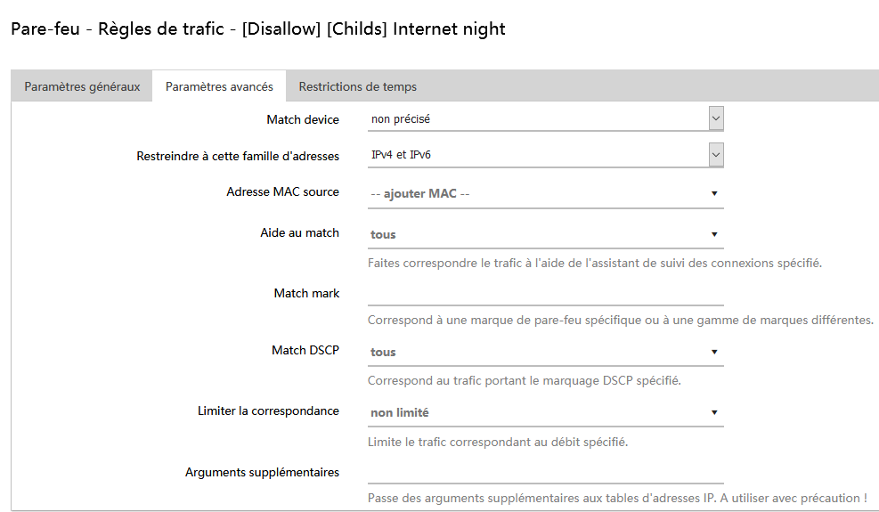 Pare-feu - Règles de trafic - Paramètres avancés