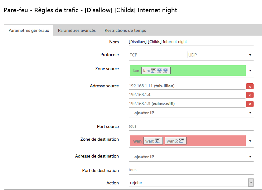 Pare-feu – Règles de trafic de contrôle parental – Restrictions de temps