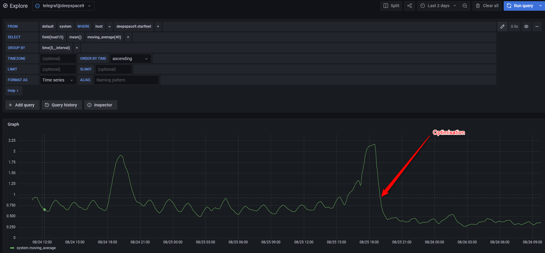 Tout ça me conforte dans l’idée que même pour un parc personnel, mettre du monitoring est obligatoire et la stack TIG (Telegraf / InfluxDB / Grafana) est vraiment pas mal pour ça.