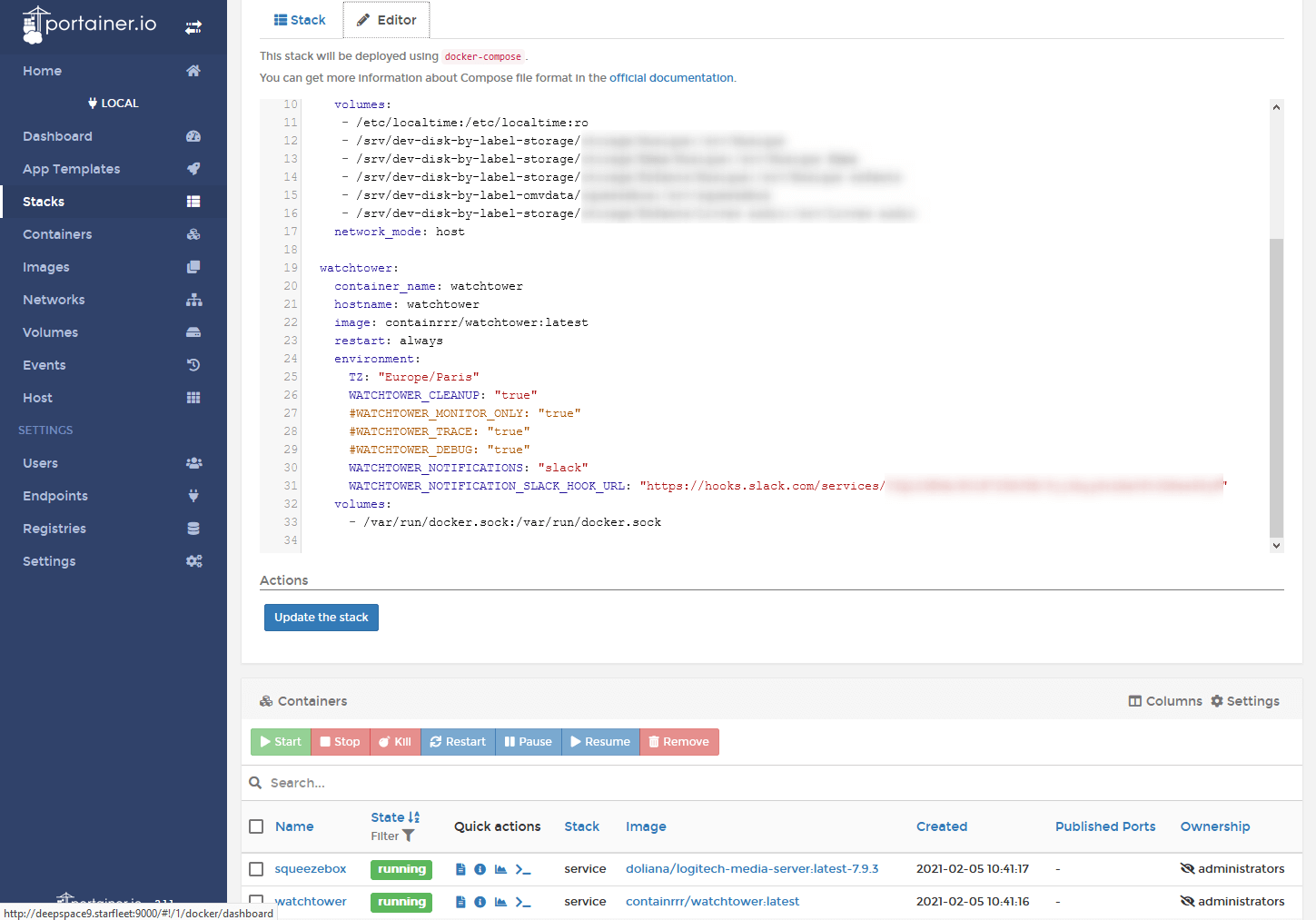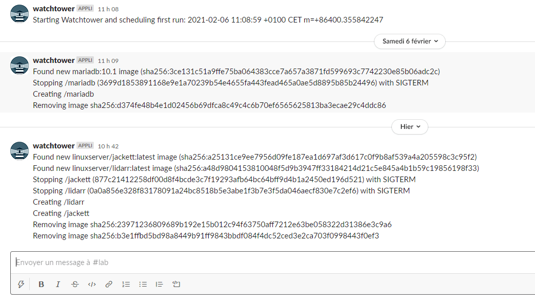 Il y a plein de possibilités de configuration, personnellement je mets à jour mes containers automatiquement, avec suppression des anciennes images (WATCHTOWER_CLEANUP) et je balance sur mon Canal Slack de notifications pour en avoir une trace (WATCHTOWER_NOTIFICATIONS).